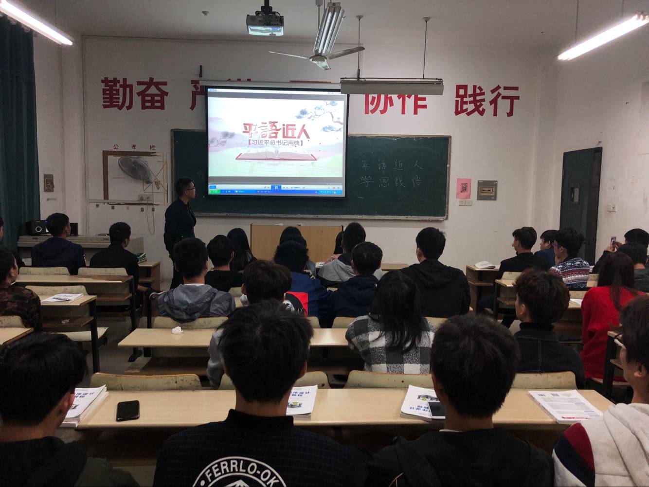 会上,辅导员熊家发带领同学们观看了《平语近人》系列节目,通过视频观看的方式学习习近平新时代中国特色社会主义思想。在视频播放结束后,熊家发老师就视频内容发布了自己的观点,向学生传达了“逐稳步子,夯实根基,久久为功,学用结合,知行合一,善用‘学问思辨‘”的理念。在解读《腹有诗书气自华》 中他提到:学习是习近平新时代中国特色社会主义思想中的“金钥匙”,要明确自己的目标和方向,稳扎稳打、通过不断地学习来提高自我,为实现中华民族伟大复兴的中国梦夯实道路。听完熊老师的发言后,同学们纷纷表示:自己正处于学习知识的黄金期,会怀揣着“不忘初心,艰苦奋斗”的信念,刻苦学习,增长本领,奋力前行!